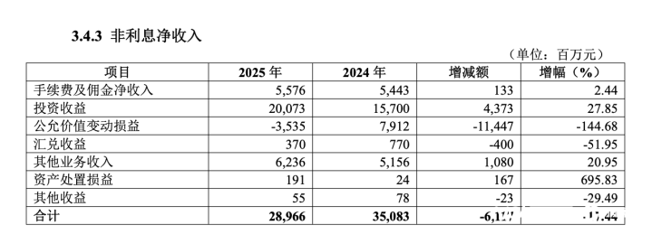 非利息收入板块虽未实现同比正增长,但结构优化趋势明显,成为盈利增长的潜在发力点。全年非利息净收入289.66亿元,同比下降17.44%,占营业收入的比重为31.51%。