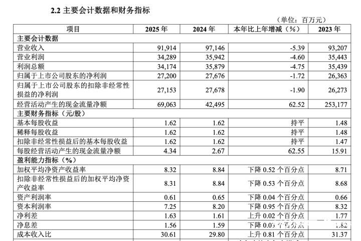 该行全年实现营业收入919.14亿元,同比下降5.39%;归母净利润272.00亿元,同比下降1.72%,盈利降幅持续收窄;年末总资产攀升至4.74万亿元,同比增长8.25%,不良贷款率同比下行,资产质量边际改善。